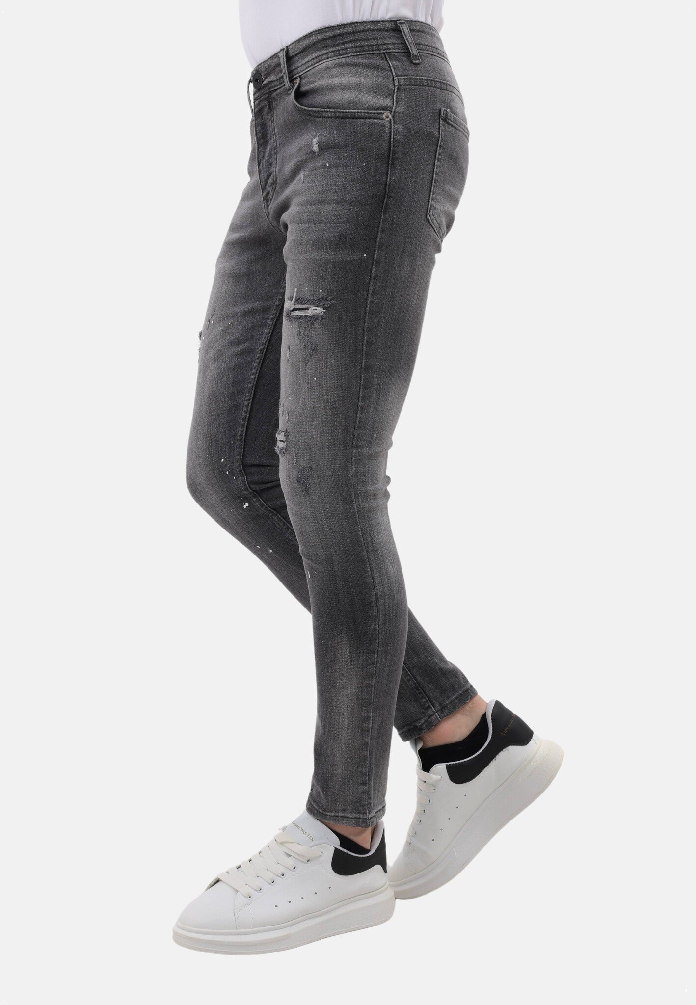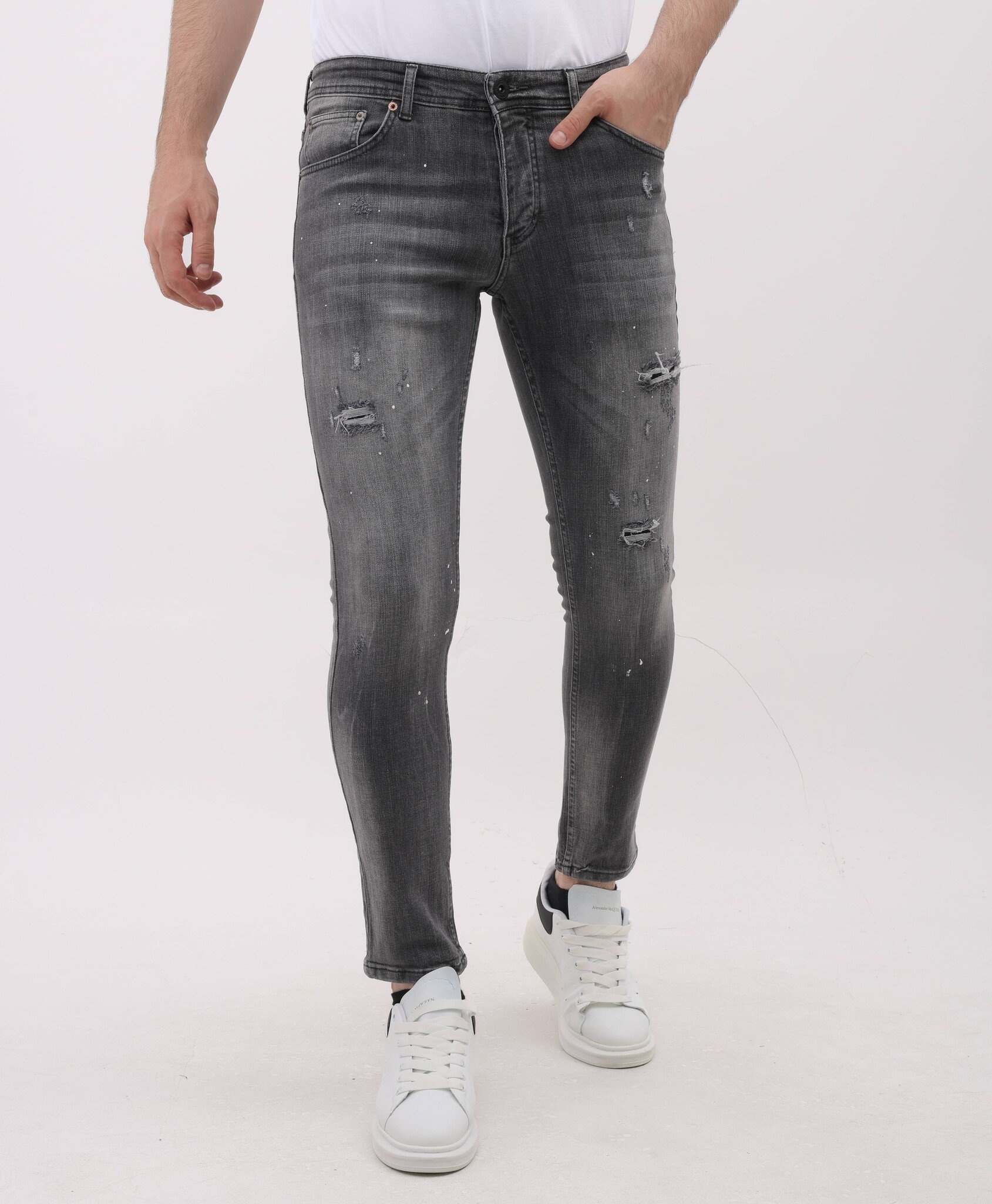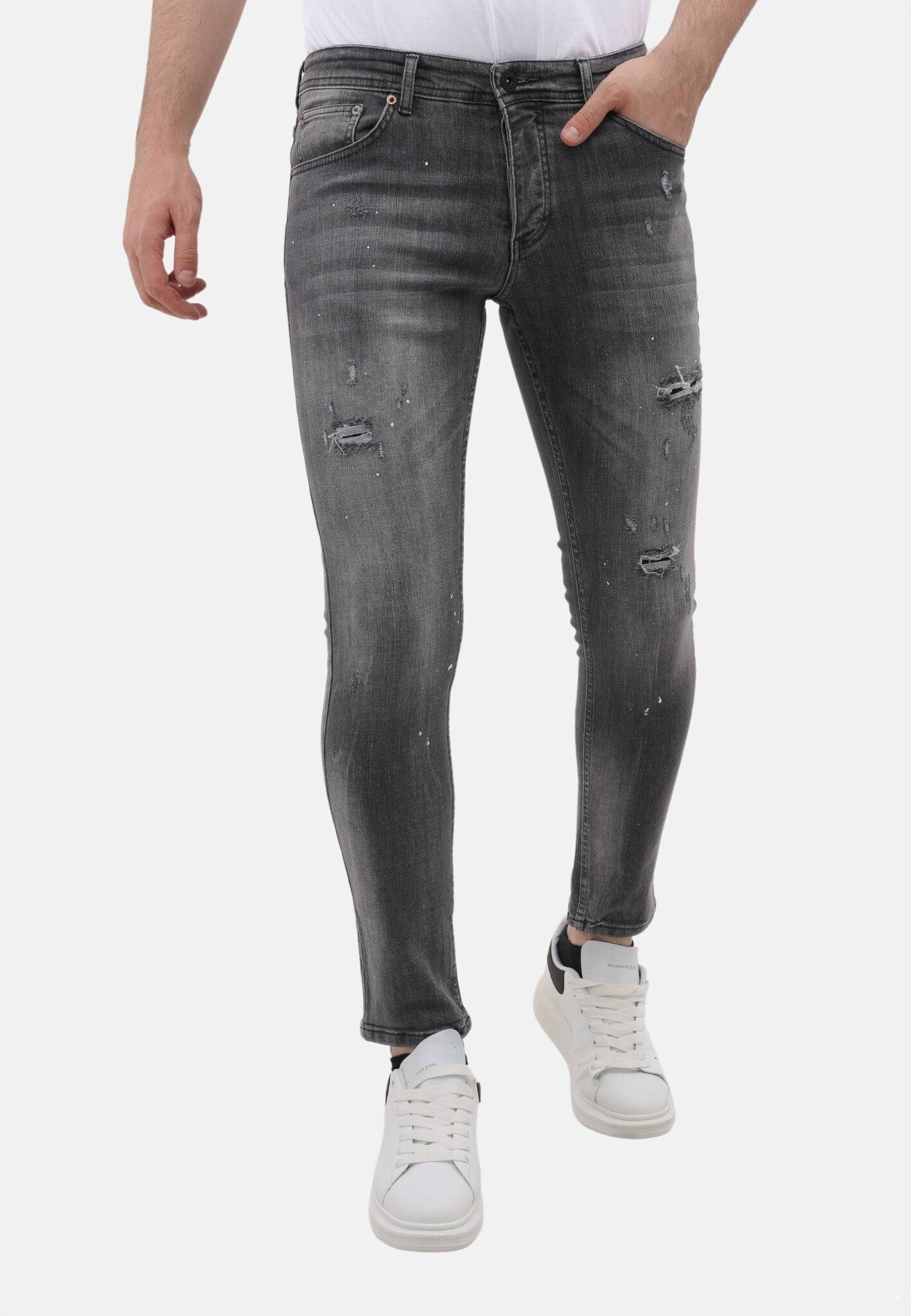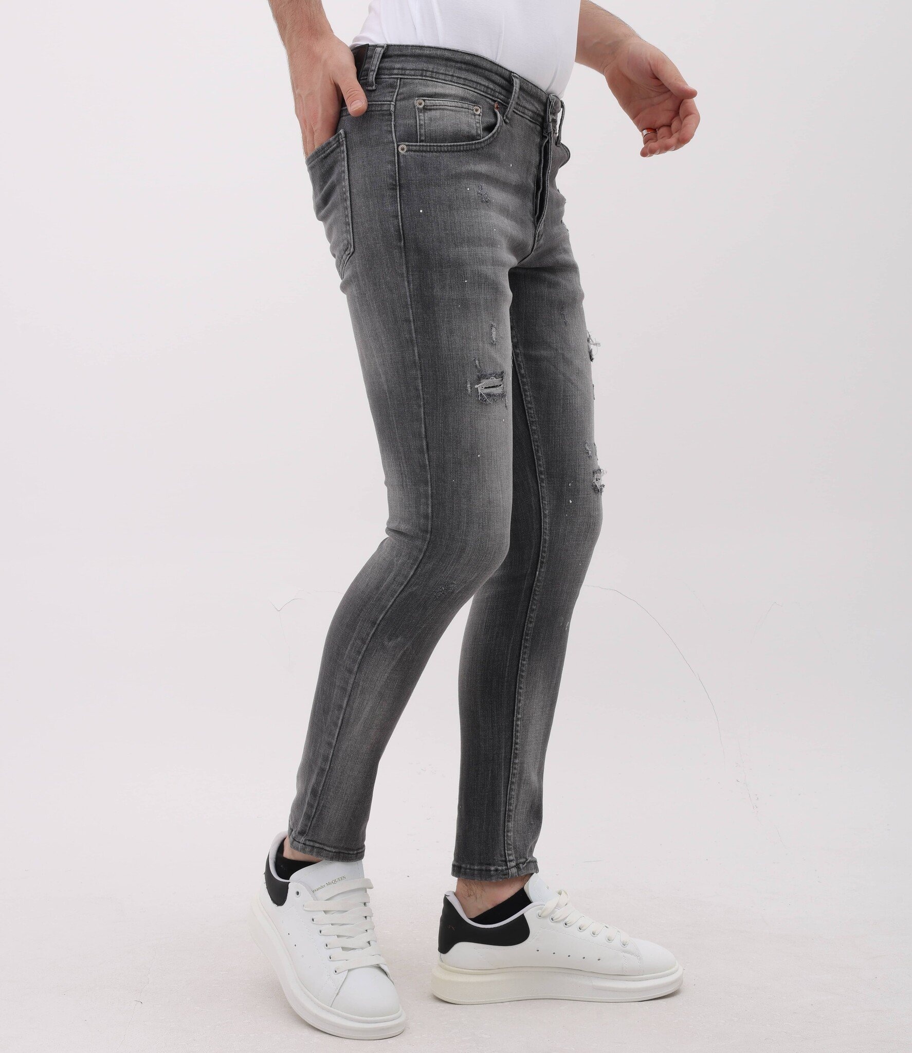 Stonewashed Slim Fit Jeans med Rips Herr - MM-S-115 - Grå