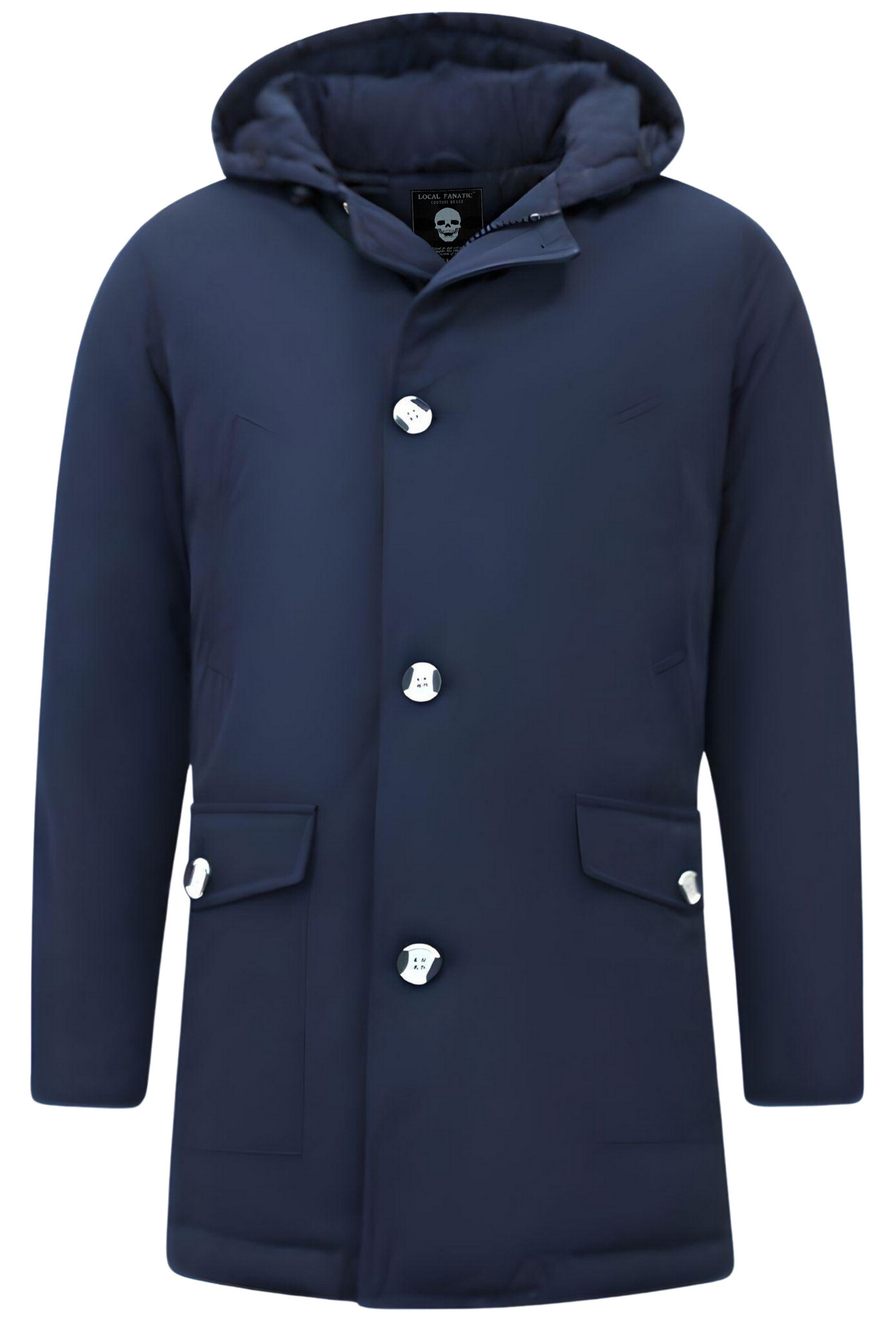 Förtryckta knappar/dragkedja vid huvan.
